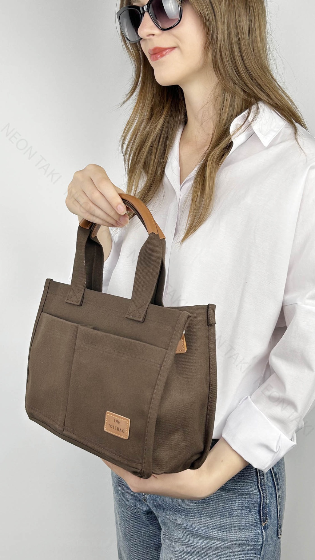 Kanvas Kumaş, İki adet Ön Cepli Tote El ve Omuz Çantası Acı Kahve, 69