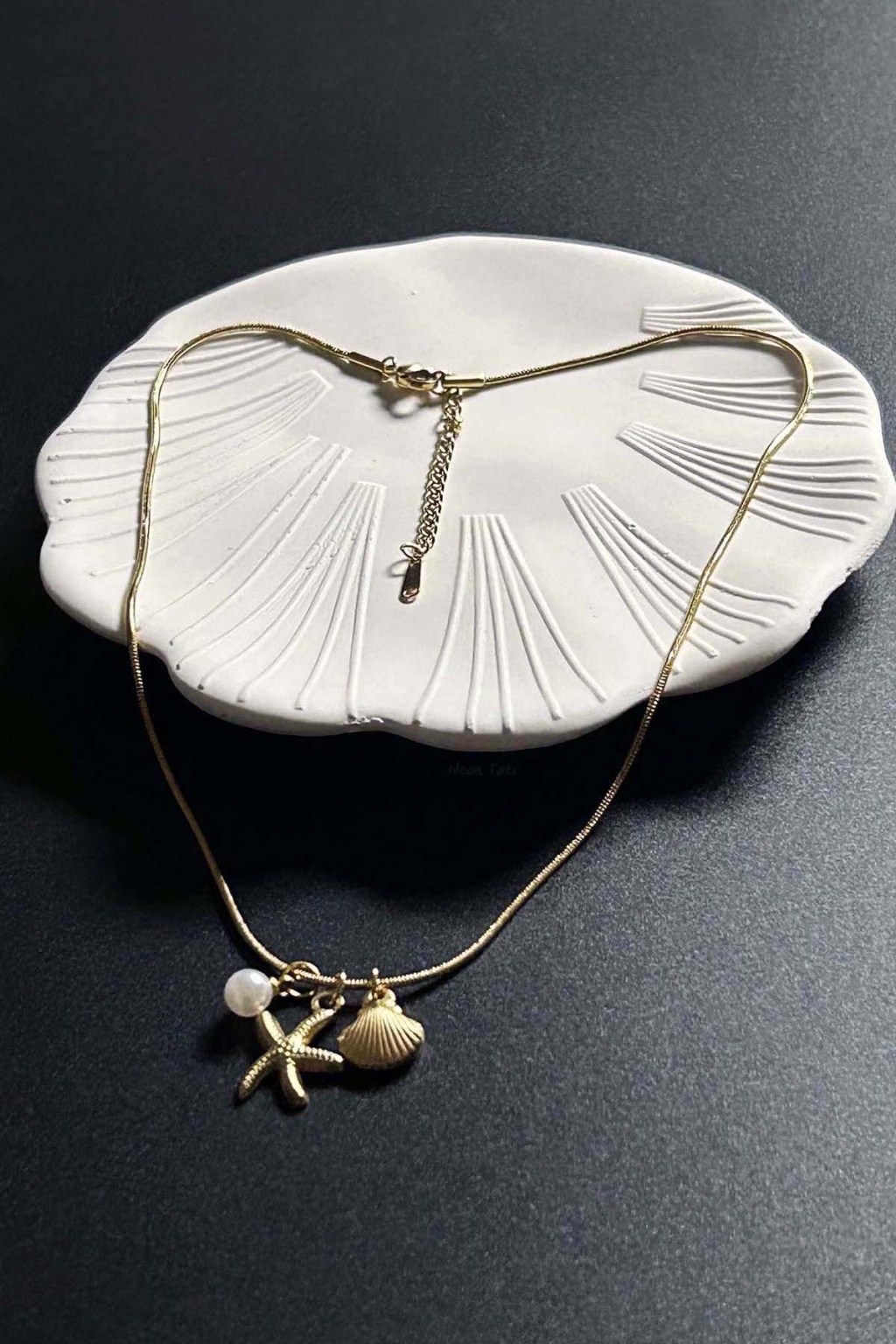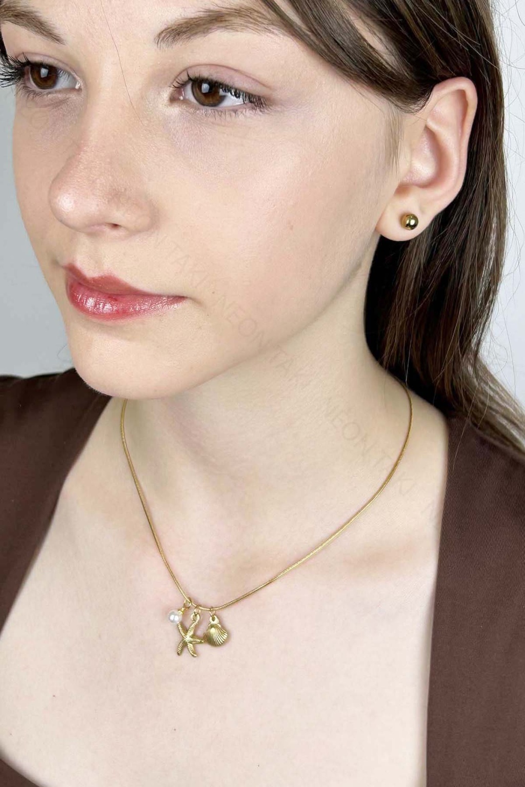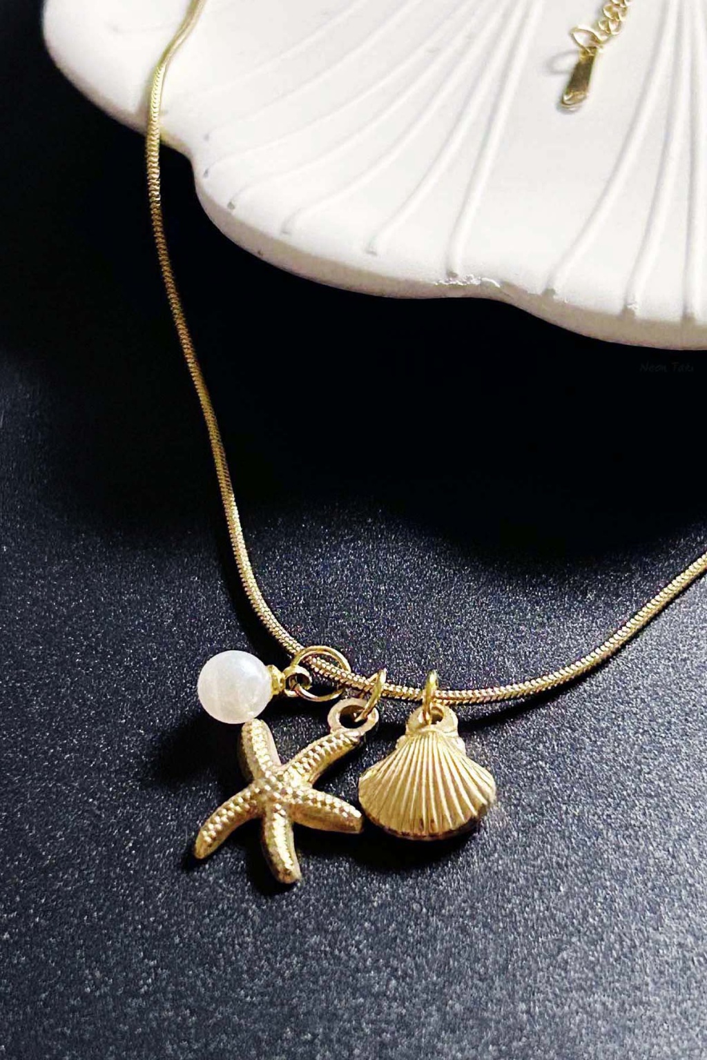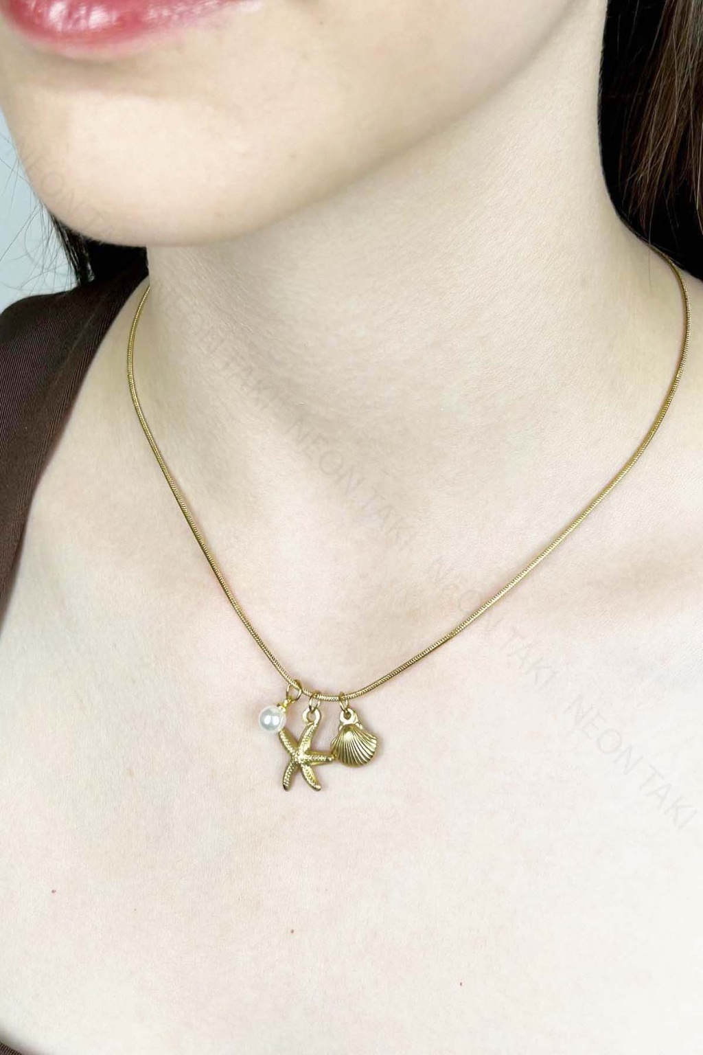 Midye, İnci, Deniz Yıldızı Charmlı Paslanmaz Çelik Kolye 411, Altın Rengi