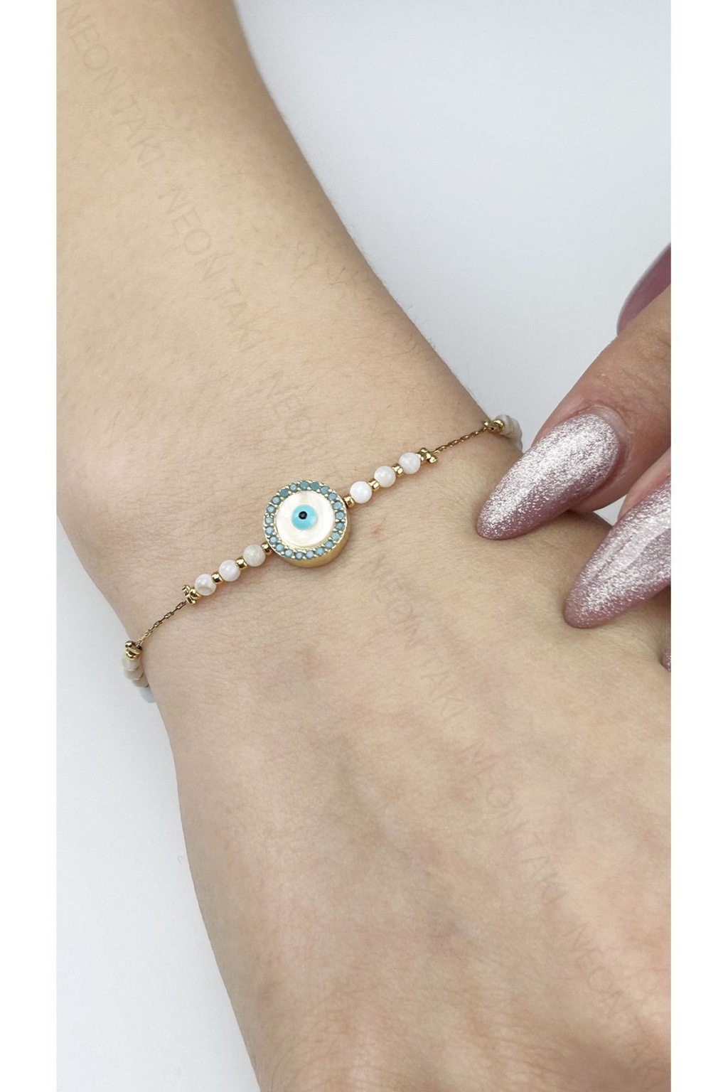 Bileklik, Zirkon Taşlı, Kararmayan Paslanmaz Çelik, Nazar Detaylı, Altın Renk, Model490