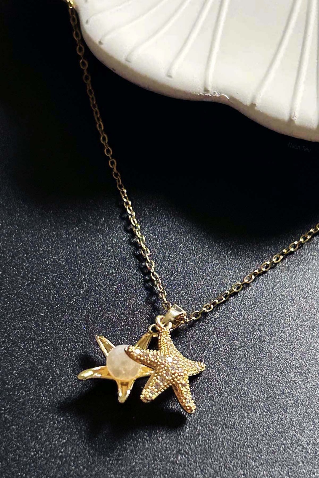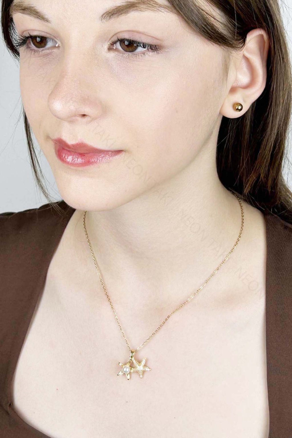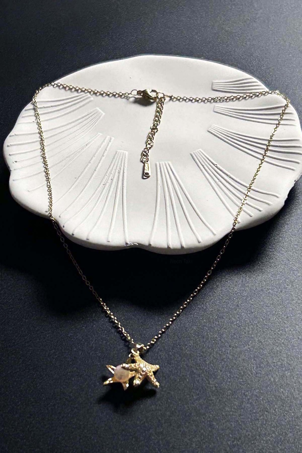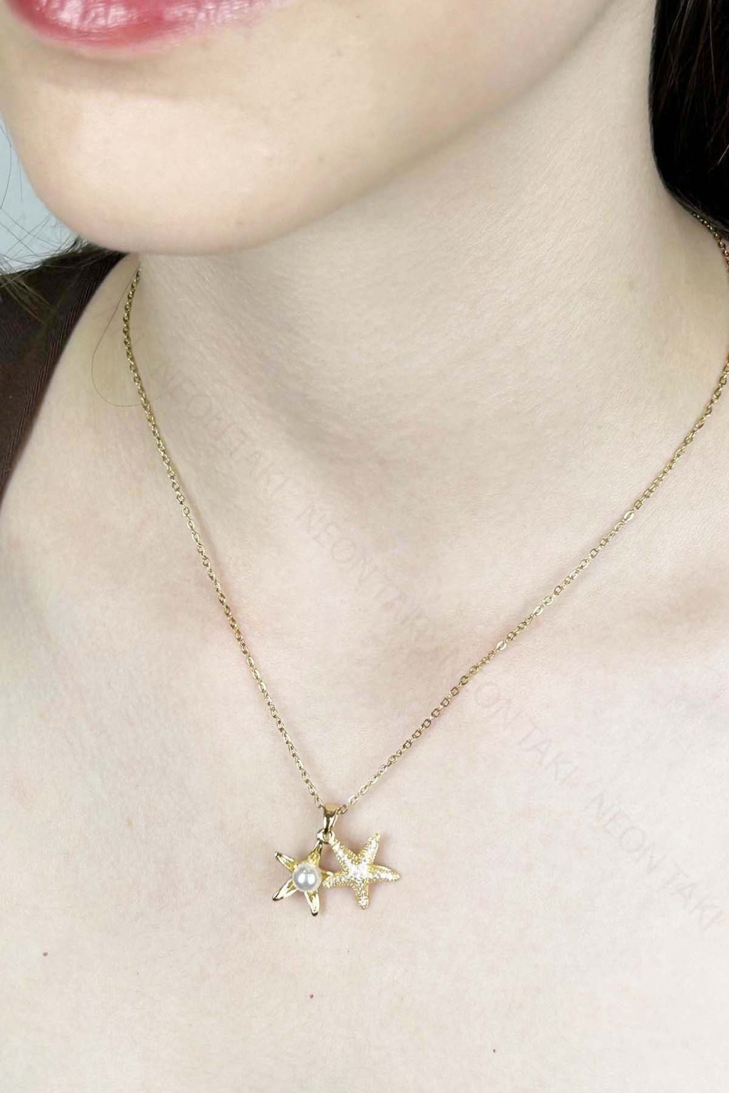 Midye, İnci, Deniz Yıldızı Charmlı Paslanmaz Çelik Kolye 411, Altın Rengi