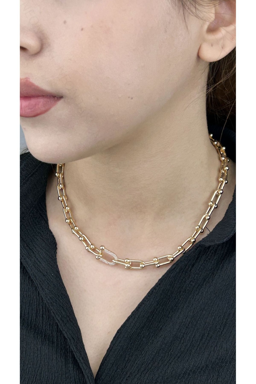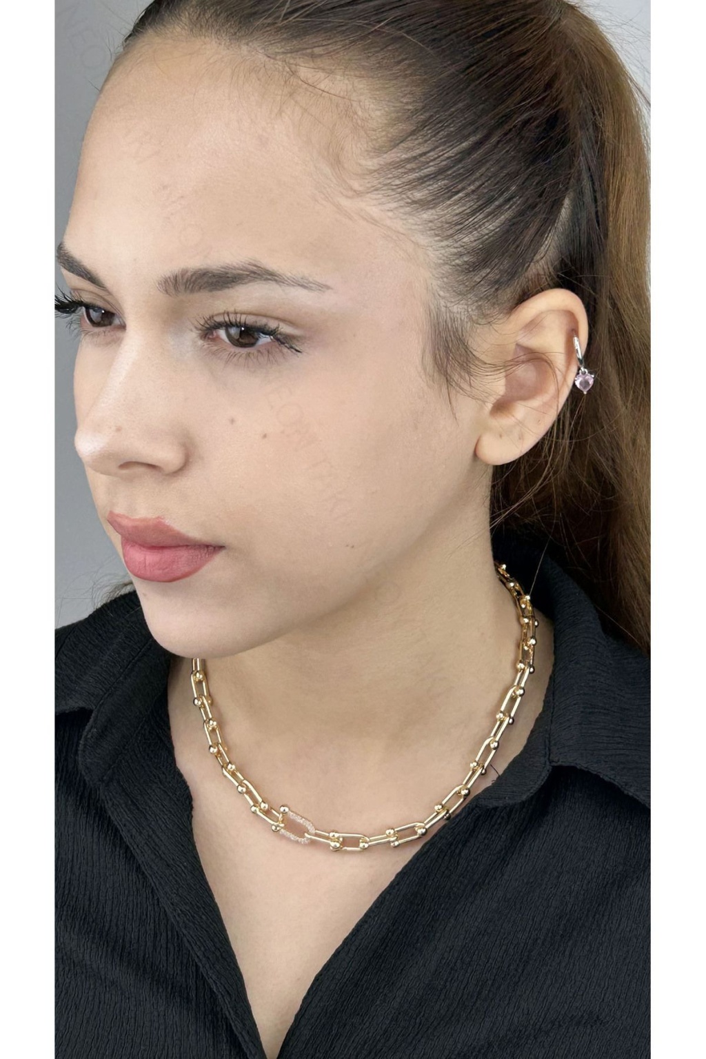 Kolye, Zirkon Taşlı, Kararmayan Paslanmaz Çelik, Kalp Detaylı, Top Zincir, Altın Renk, Model230