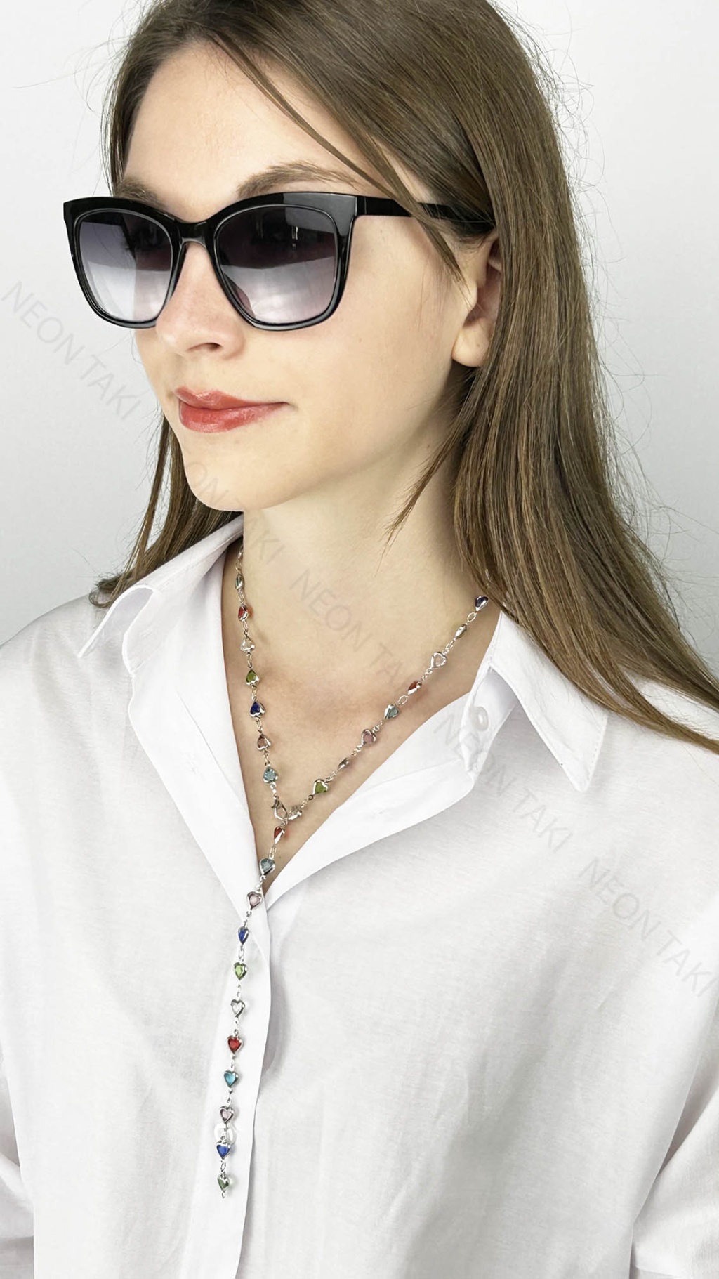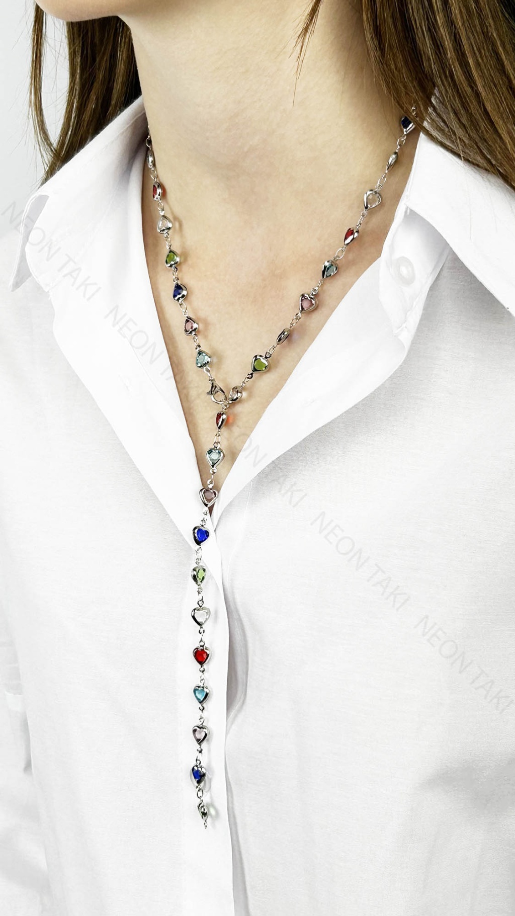 Y Kolye, Taşlı, Çok Renkli, Kalpli, Kolye 433, Kasa Gümüş Renk