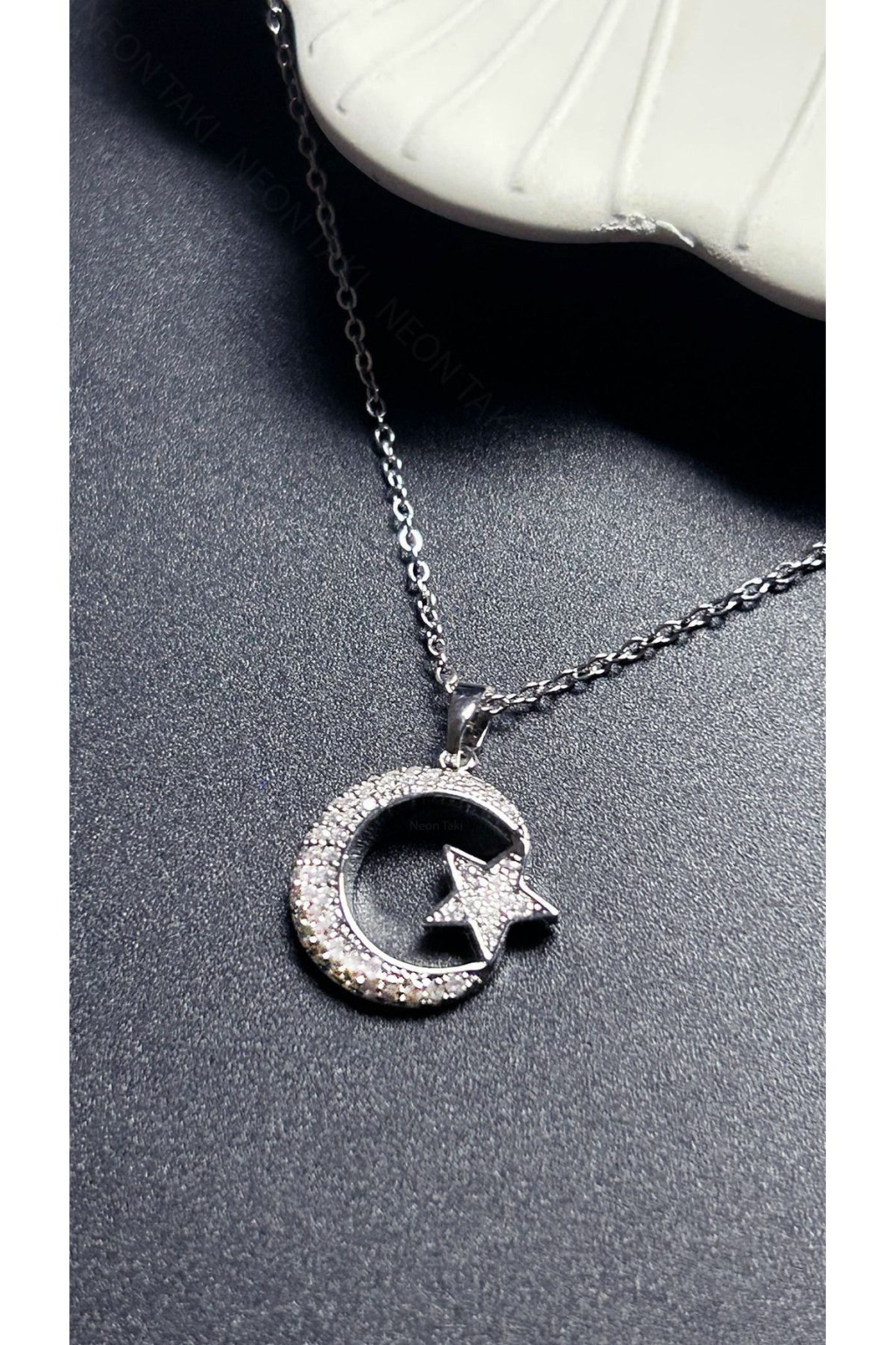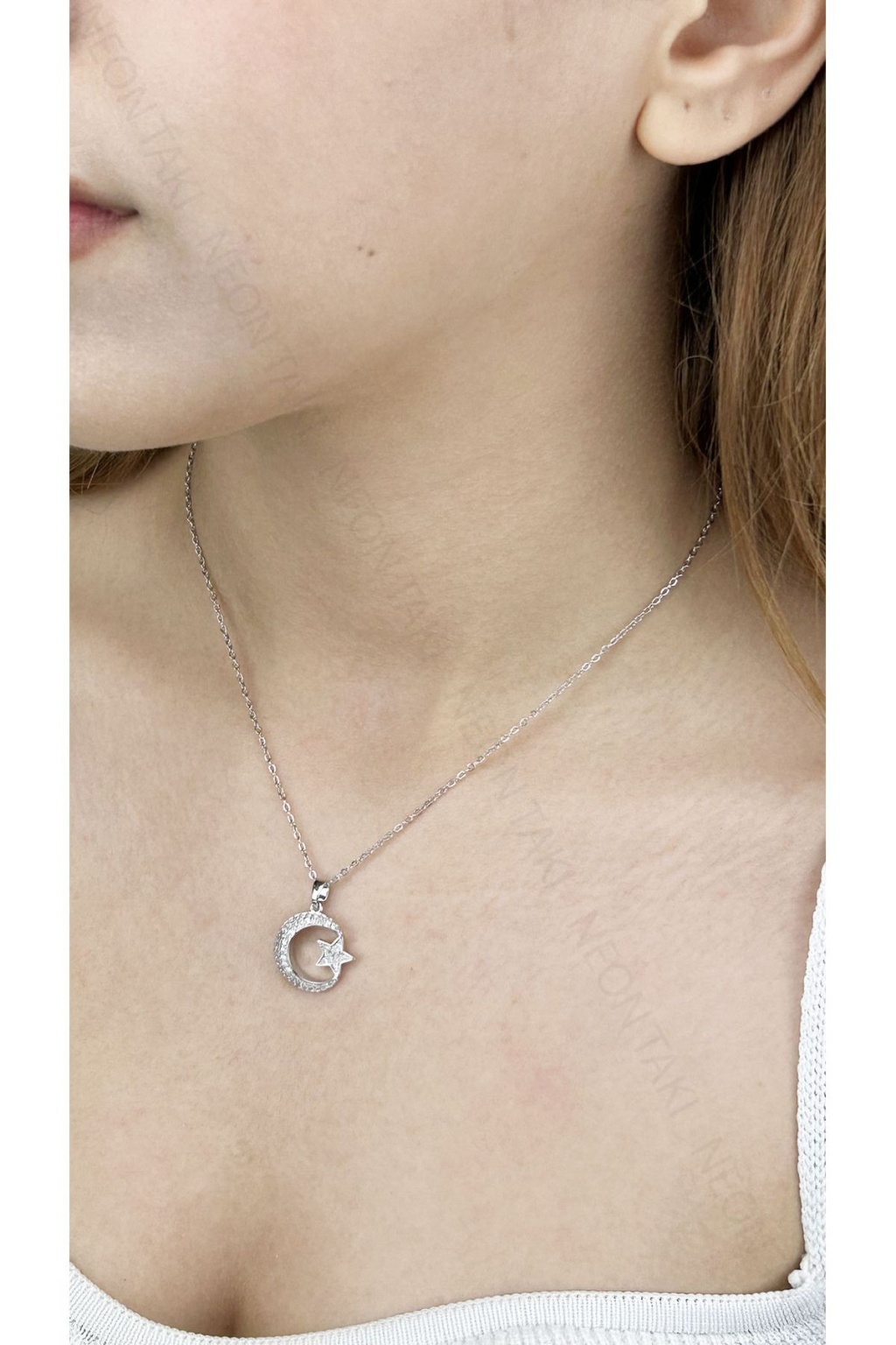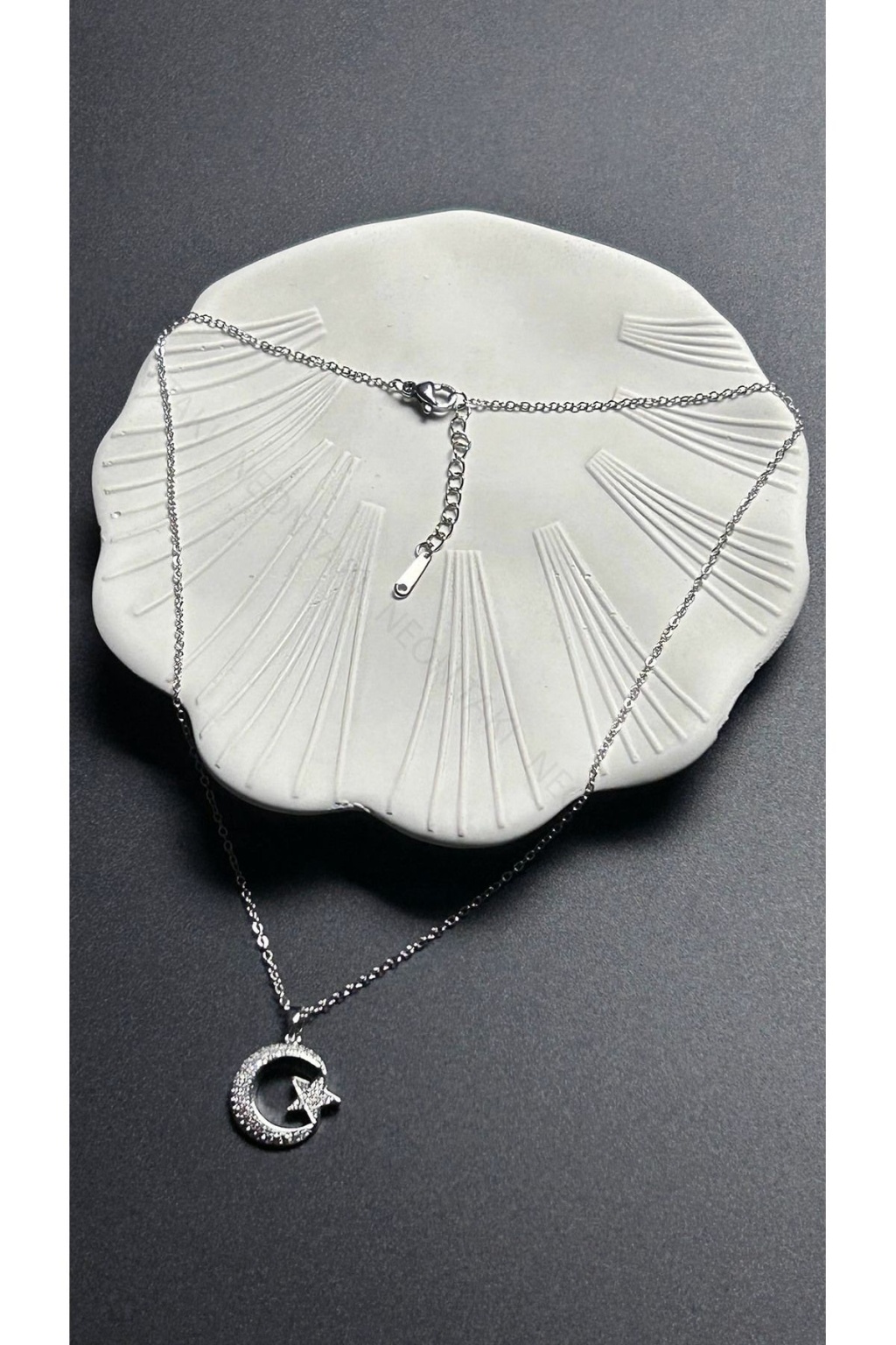Kolye, Zirkon Taşlı, Kararmayan Paslanmaz Çelik, Ay ve Yıldız Detaylı, Gümüş Renk, Model402