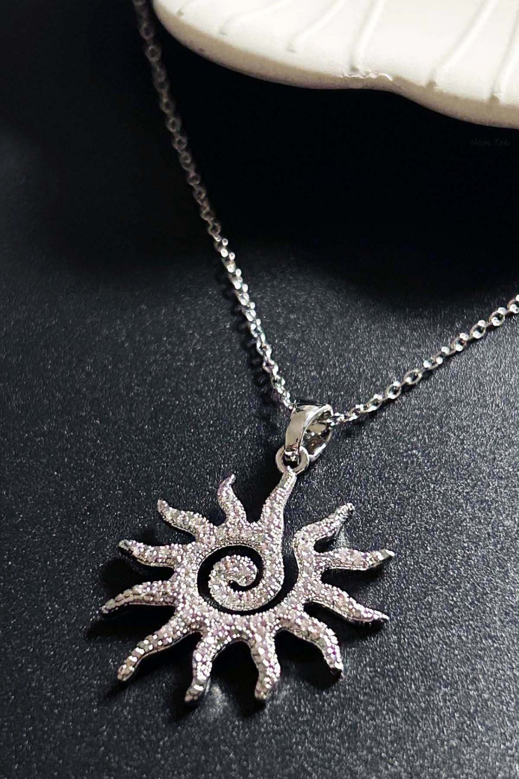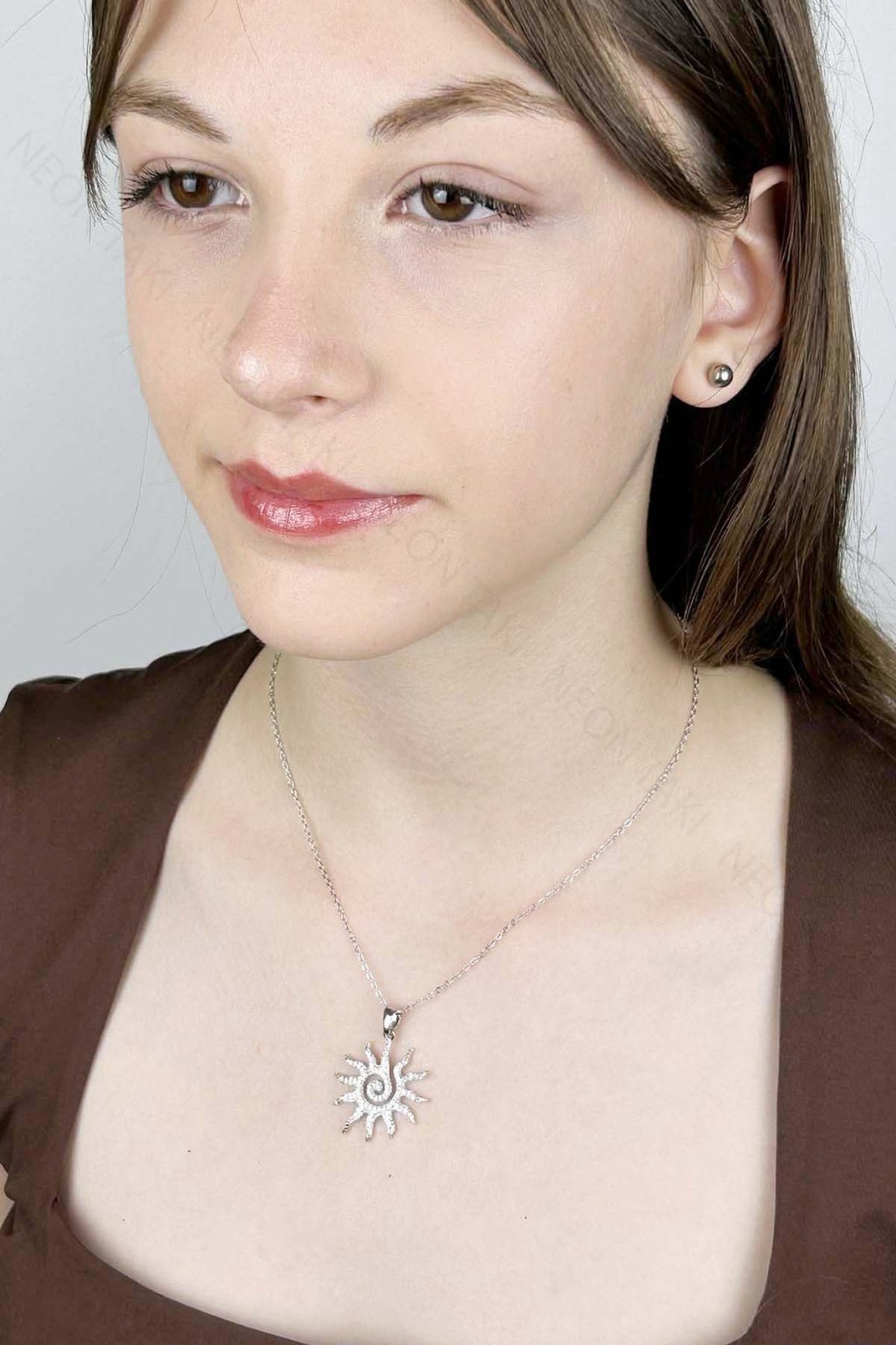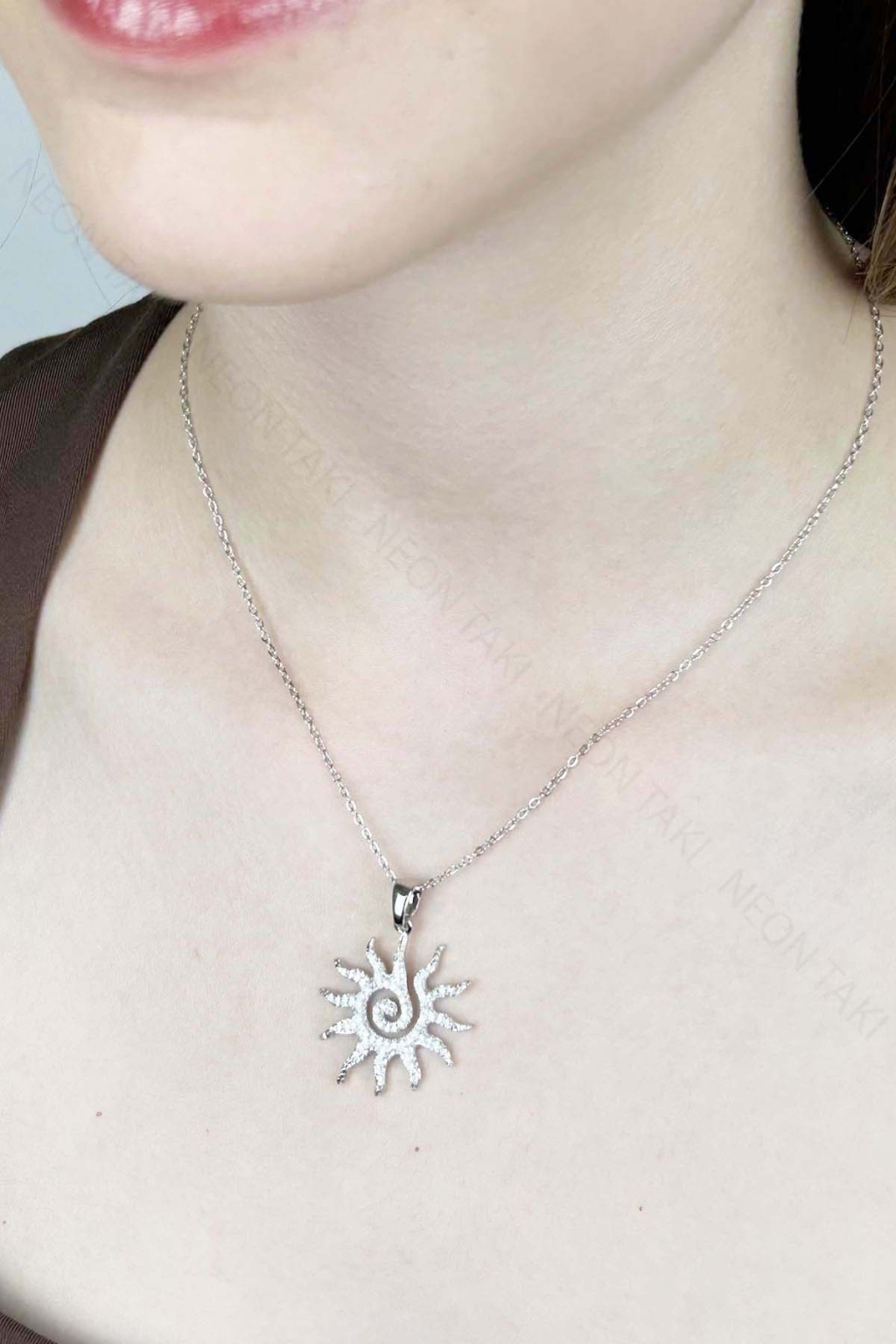 Zirkon Taşlı, Güneş Figürlü Paslanmaz Çelik Kolye 414, Gümüş Renk