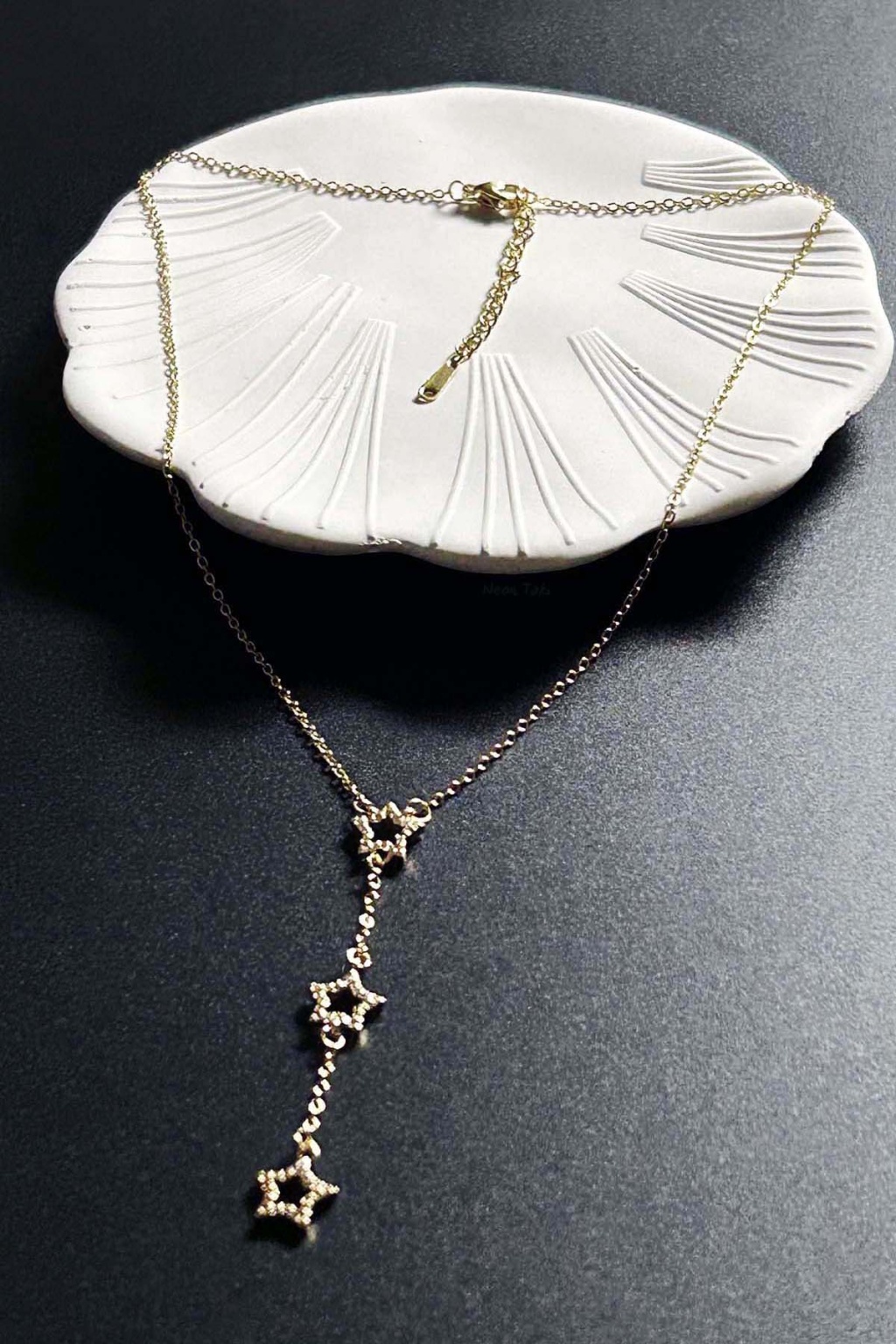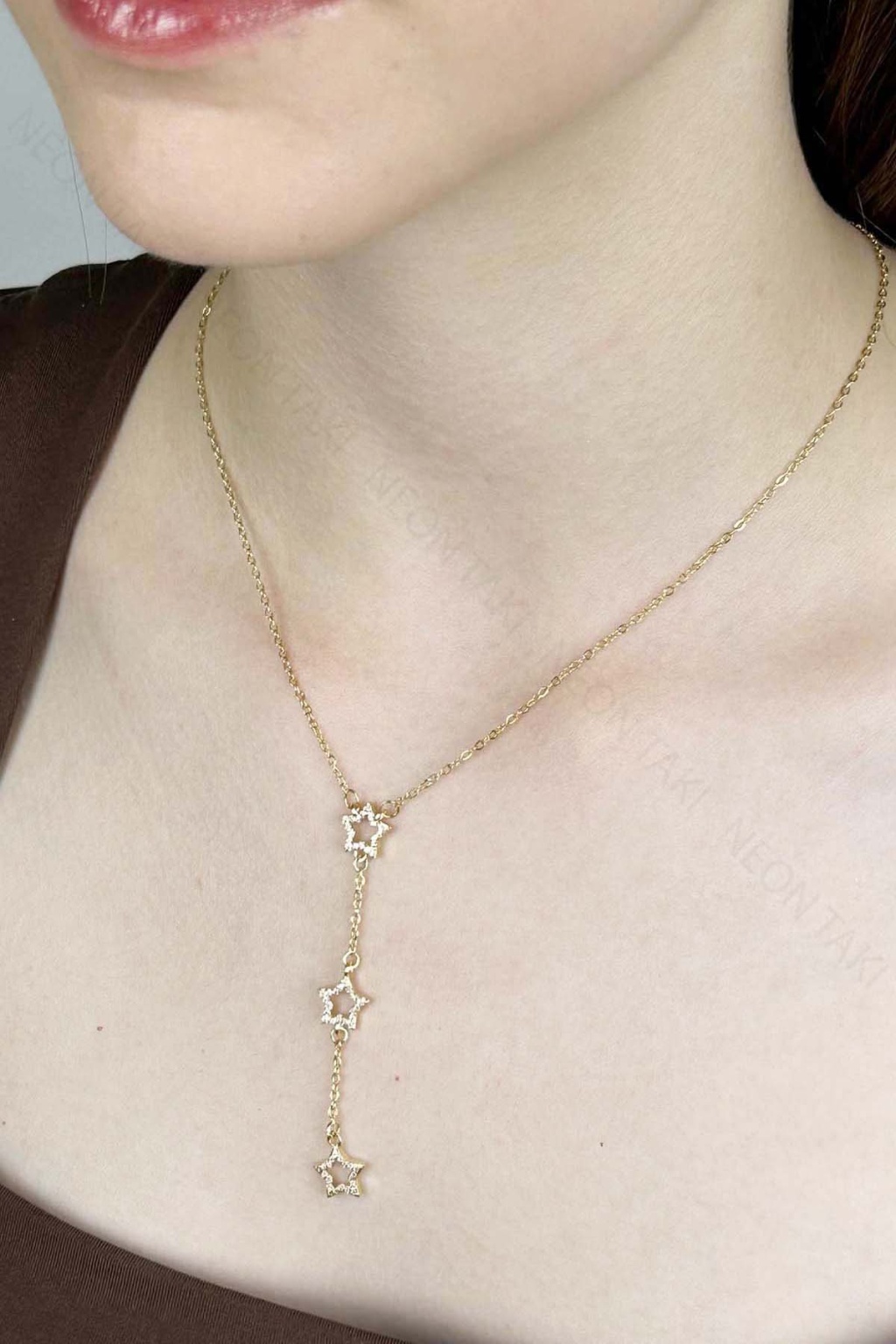 Zirkon Taşlı Yıldızlı Y kolye, Paslanmaz Çelik Kolye 407, Altın Renk